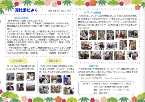 恵比須便り 2025年7月 2025 12/05 恵比須便り 2025-07-162025-12-05 2025年7月の恵比須便りをお届けします。PDFはこちらからダウンロード。 2025年7月 恵比須便り よかったらシェアしてね! URLをコピーしました! URLをコピーしました! 七夕飾り作り(令和7年7月6日) あおい・うめユニット合同行事「すいか割り、そうめん流し」(令和7年8月8日) この記事を書いた人 shukeikai 関連記事 恵比須便り 2026年1月 2026-01-14 恵比須便り 2025年12月 2025-12-23 恵比須便り 2025年11月 2025-11-17 恵比須便り 2025年10月 2025-10-28 恵比須便り 2025年9月 2025-10-28 恵比須便り 2025年8月 2025-10-28 恵比須便り 2025年6月 2025-06-16 恵比須便り 2025年4月 2025-05-14 コメント コメントする コメントをキャンセルコメント ※ 名前 メール サイト 次回のコメントで使用するためブラウザーに自分の名前、メールアドレス、サイトを保存する。 Δ
