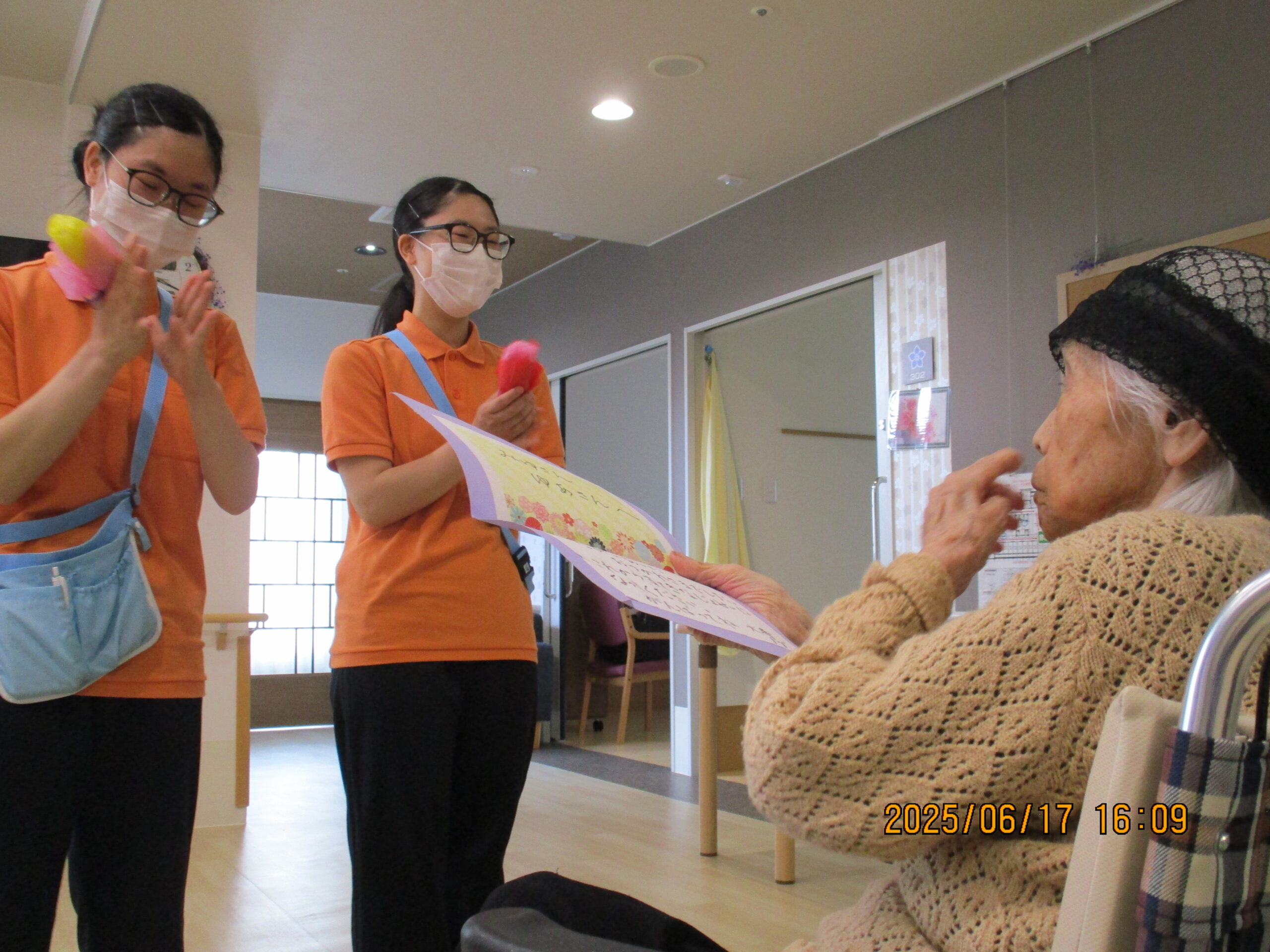 レクリエーションも、入居者様、職員ともにとても盛り上がり、最後は、入居者様から実習生へのお手紙に涙ぐむ職員もいました。
