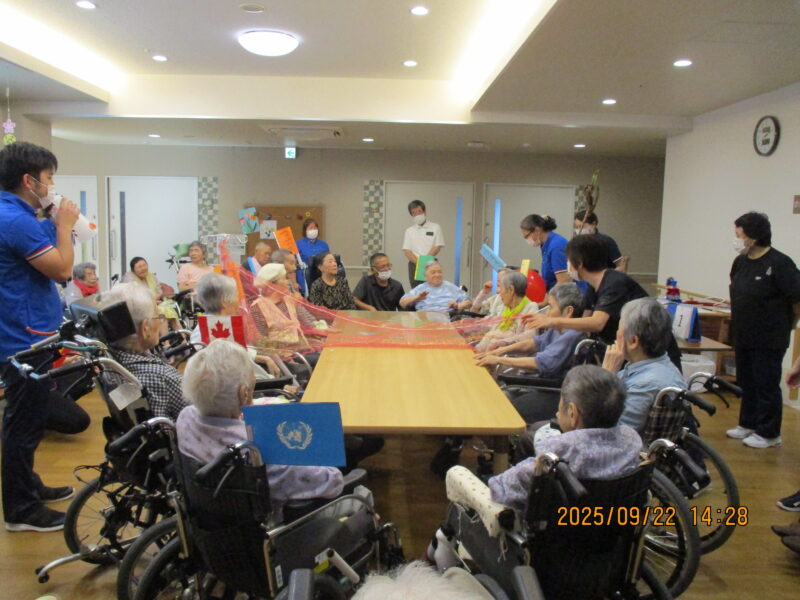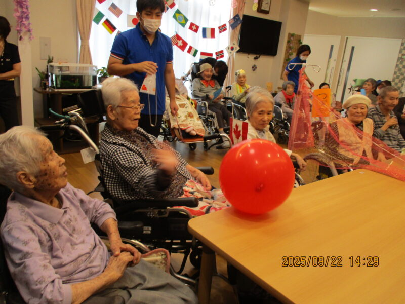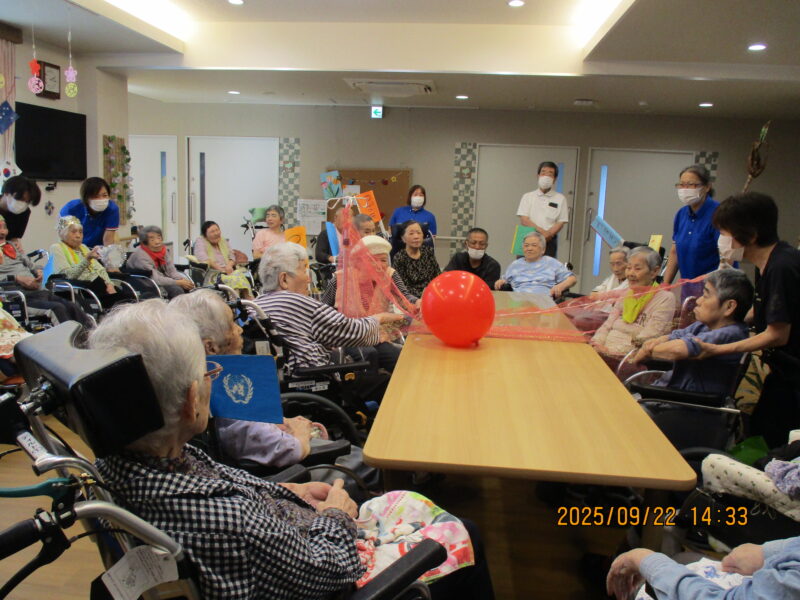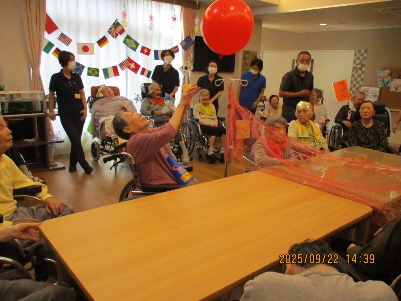 1週間後の9月22日に敬老会を開催しました。皆で風船バレーボール大会をおこないましたので、その様子をお届けします。