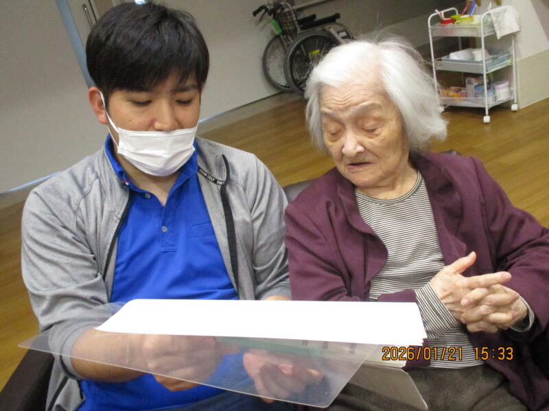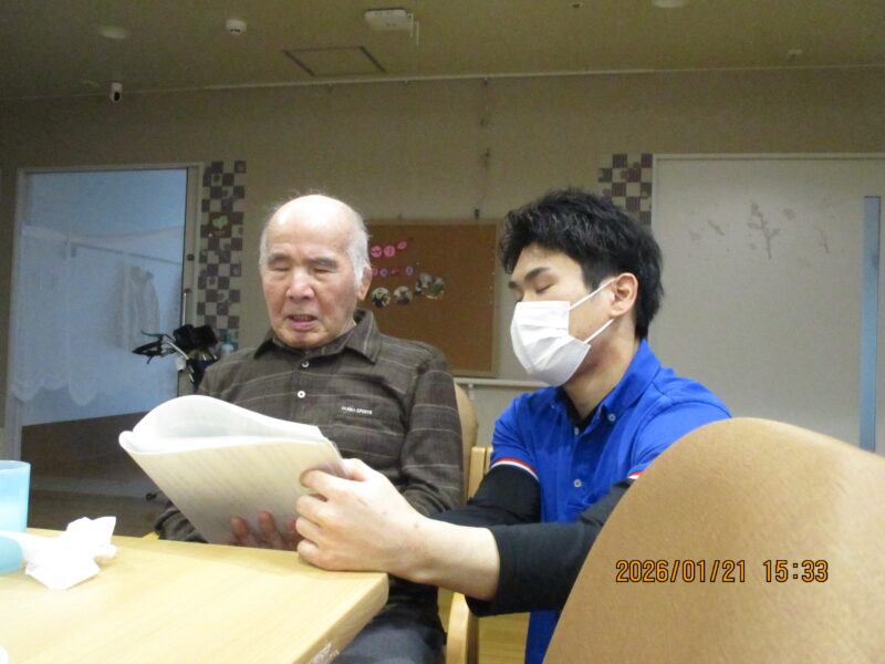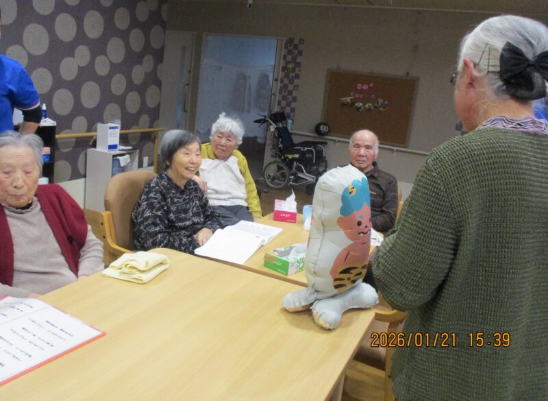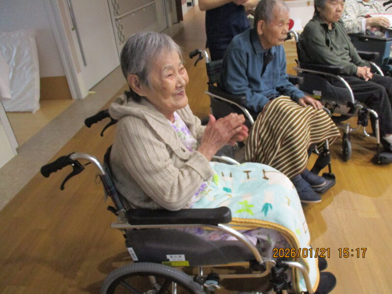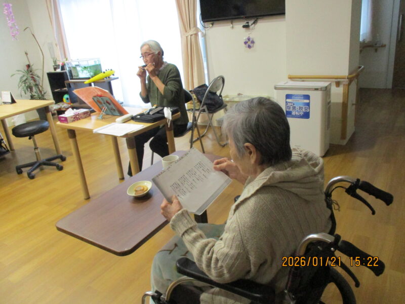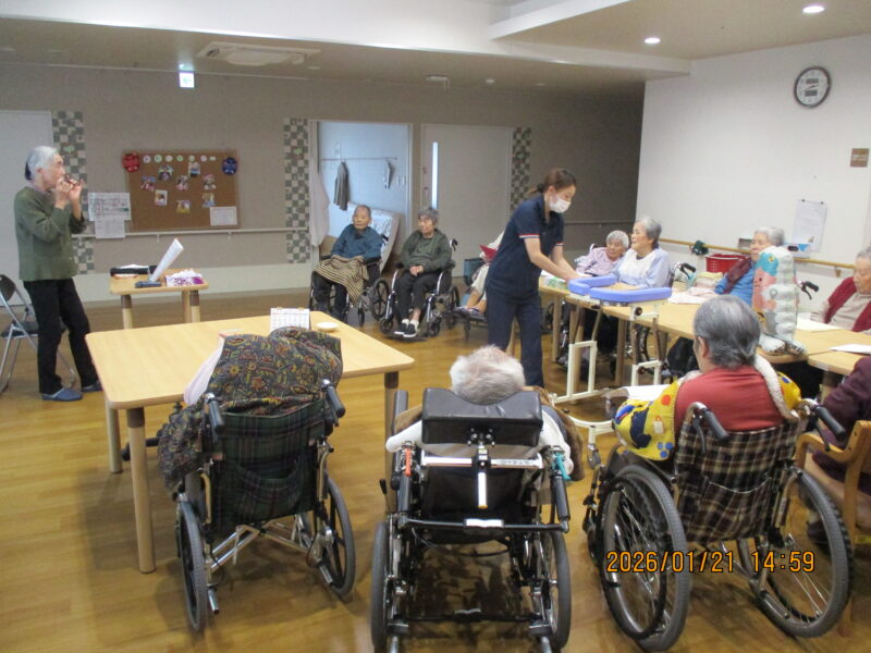 現在3名の方が交互に週1回ずつ来られ、入居者様とお話やミニゲームをしたり、その方の得意なハーモニカ演奏をして下さり、入居者様もとても喜ばれています。