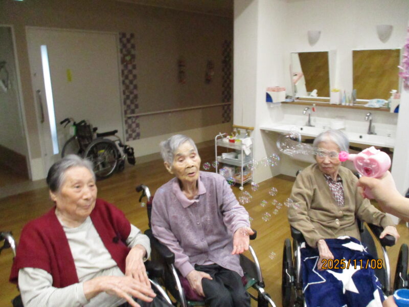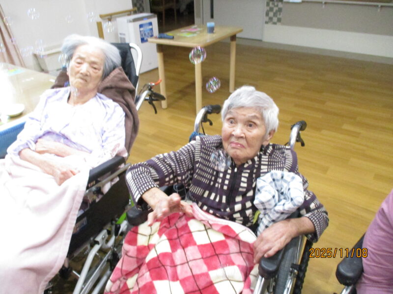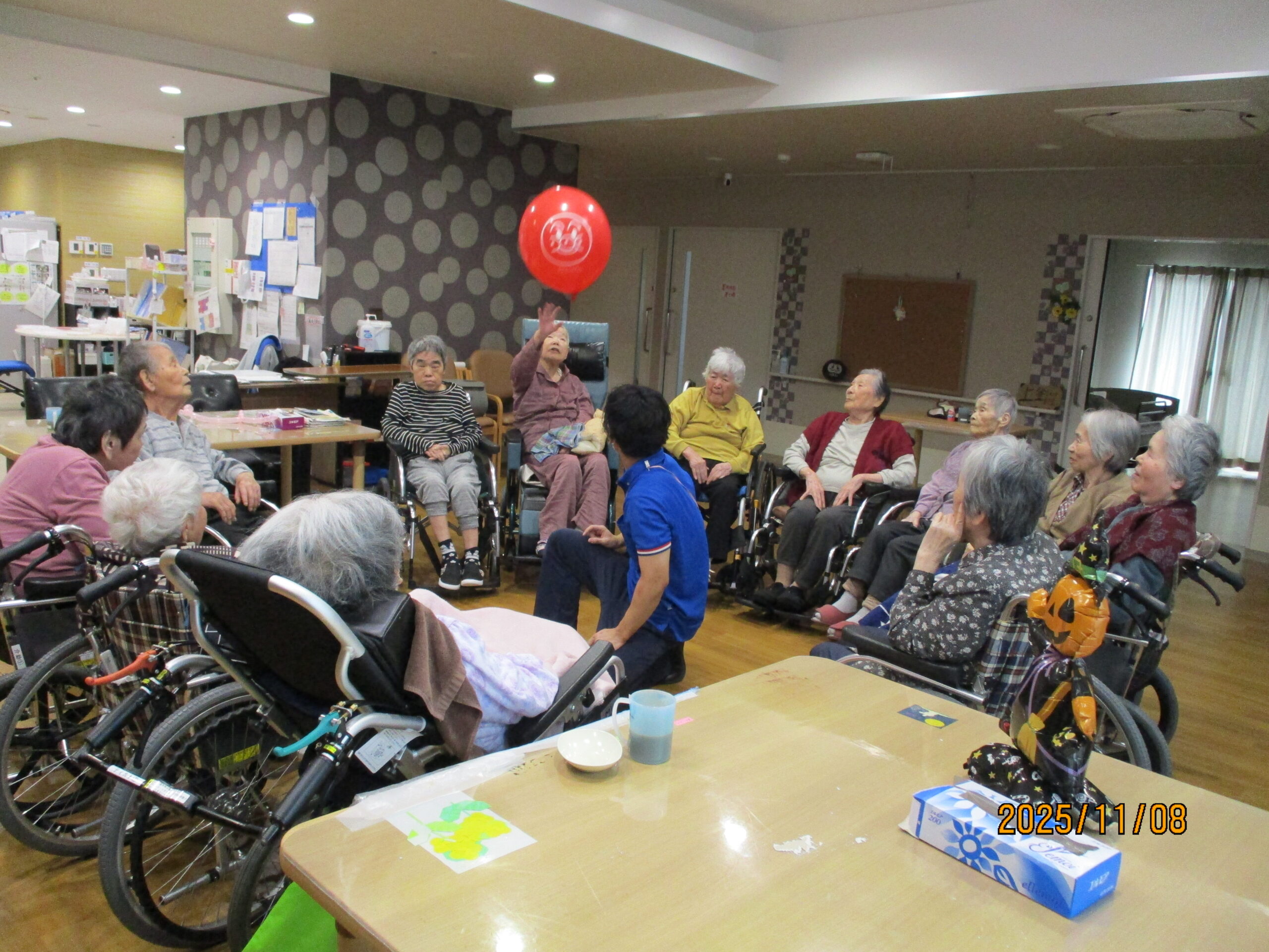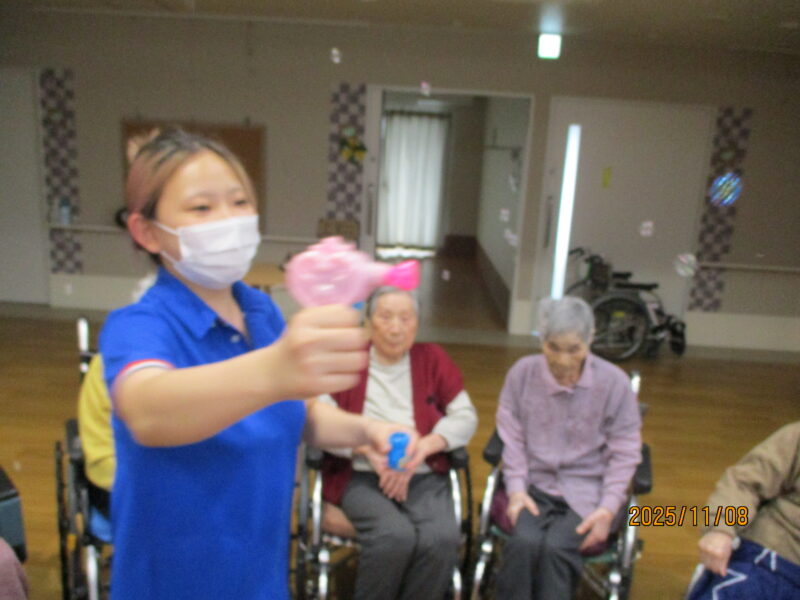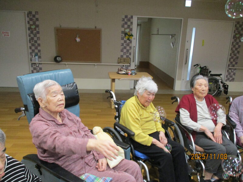 少しずつ朝晩のみでなく日中の気温も下がり始め、寒くて体を動かすのが億劫になってしまいがちですが、体操や風船バレー、室内でシャボン玉を行い、体も温まり皆さんで楽しい時間を過ごしました。