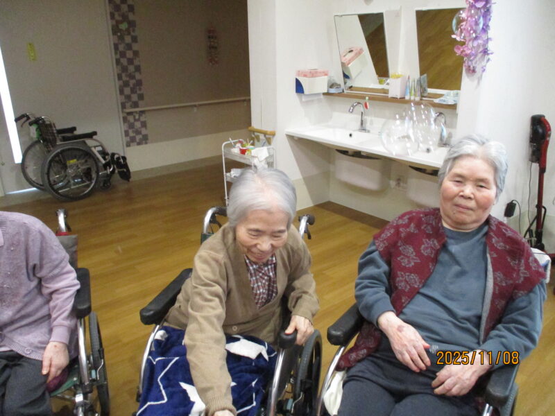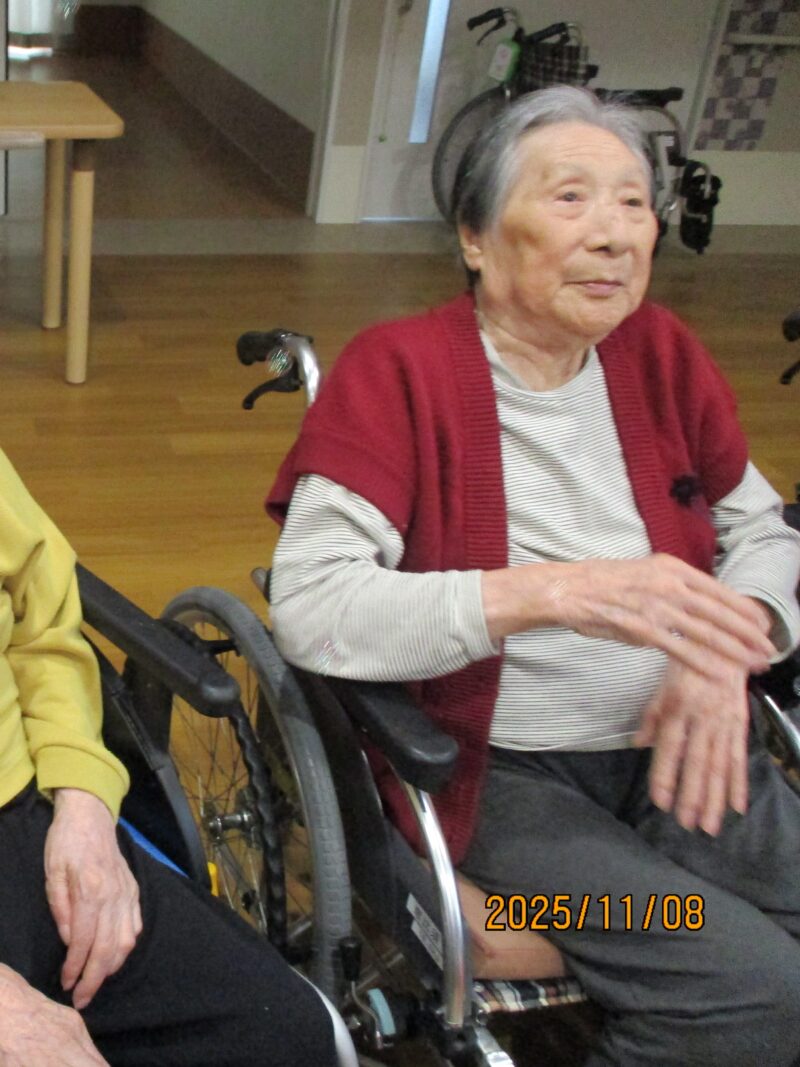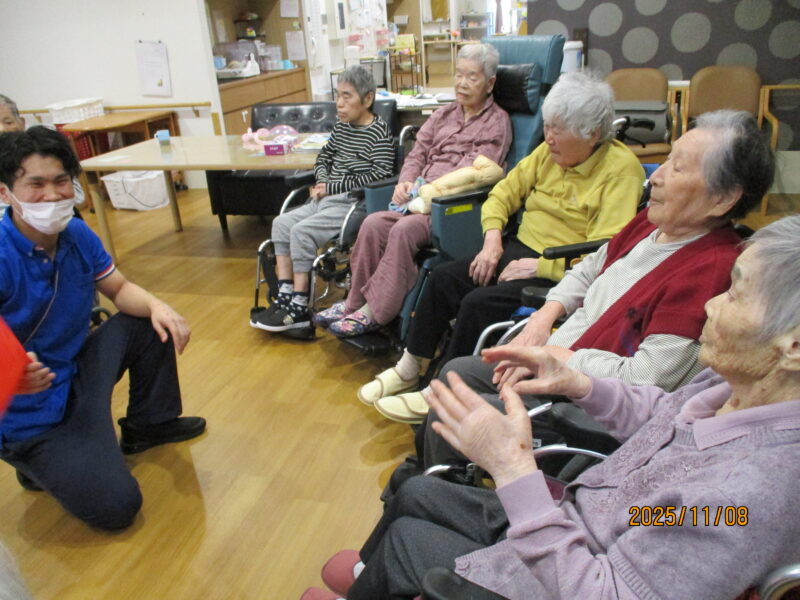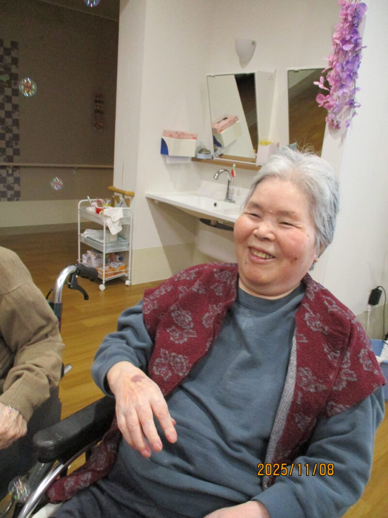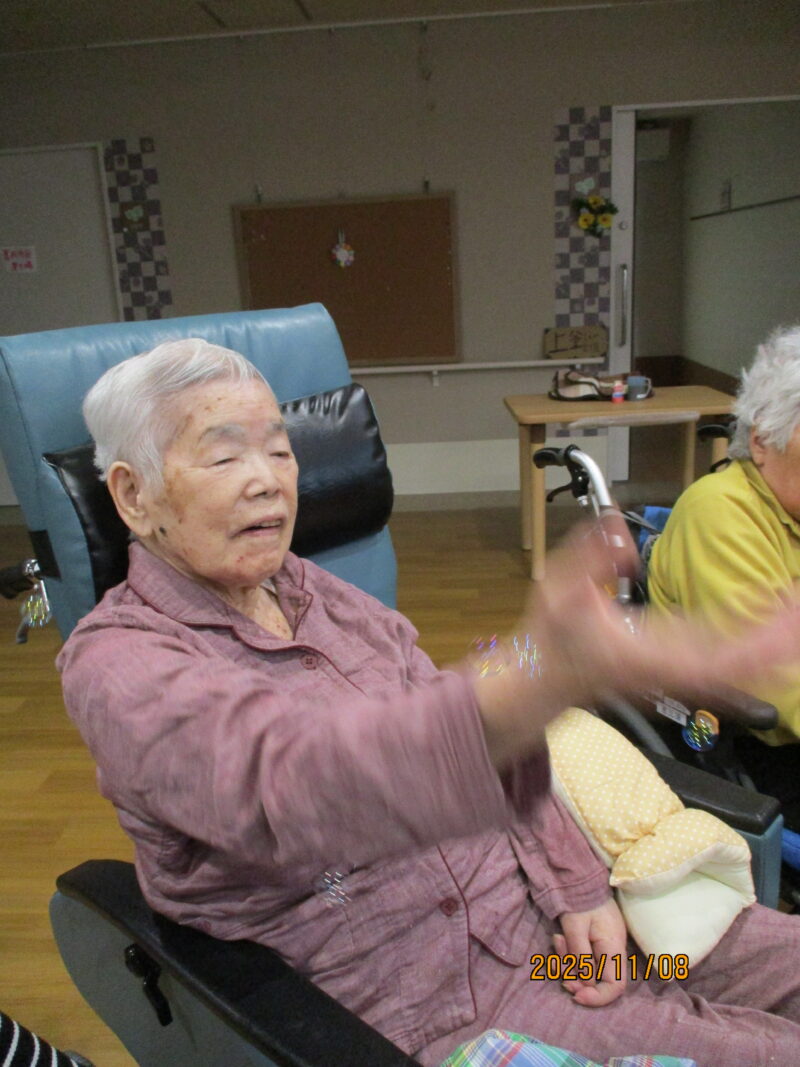 少しずつ朝晩のみでなく日中の気温も下がり始め、寒くて体を動かすのが億劫になってしまいがちですが、体操や風船バレー、室内でシャボン玉を行い、体も温まり皆さんで楽しい時間を過ごしました。